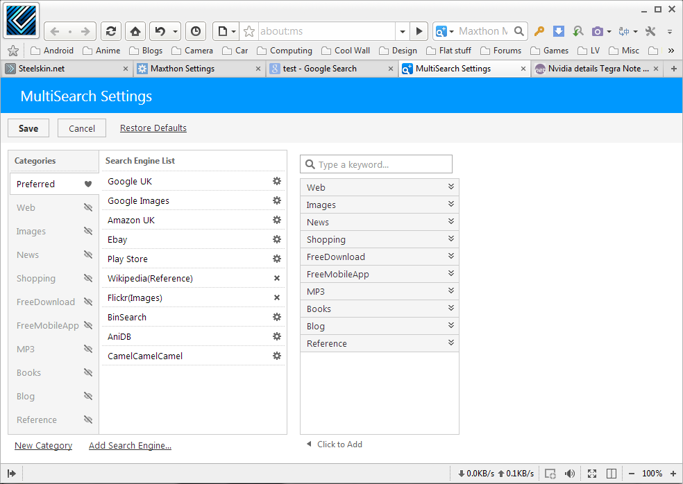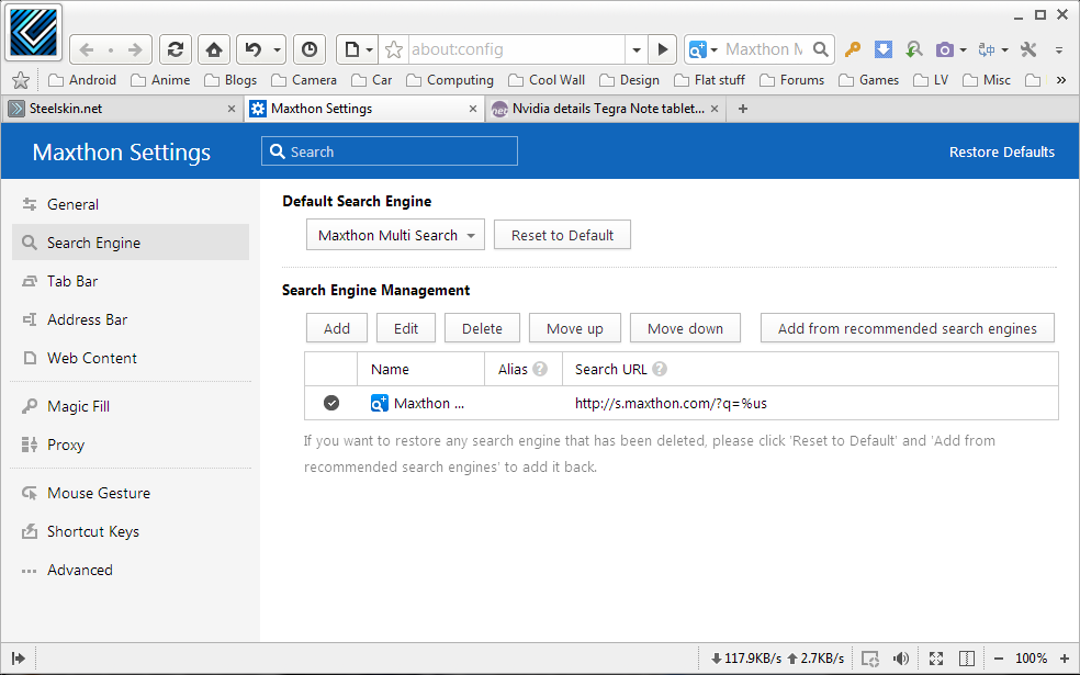 Notice how easy it is to add a search in Opera? in Maxthon you must visit the site, then do a search, say _http://www.bit-tech.net/search?q=test_ and then change it into a search string _http://www.bit-tech.net/search?q=%us_ or _http://www.bit-tech.net/search?q=s_